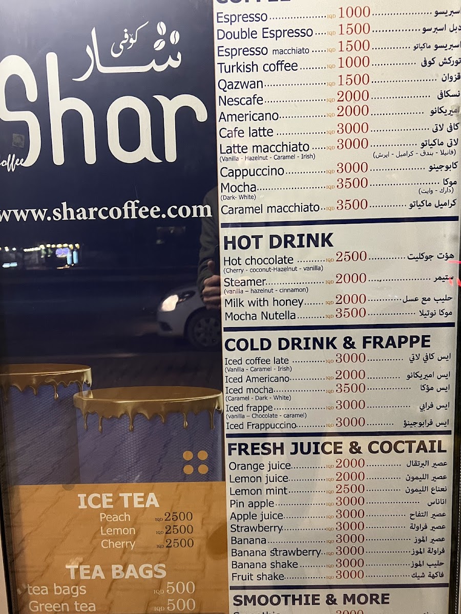 Welcome to Shar Coffee, the delightful café nestled just in front of EMC Hospital in Erbil. This charming spot offers a diverse and attractive menu that caters to both coffee enthusiasts and casual drinkers alike.